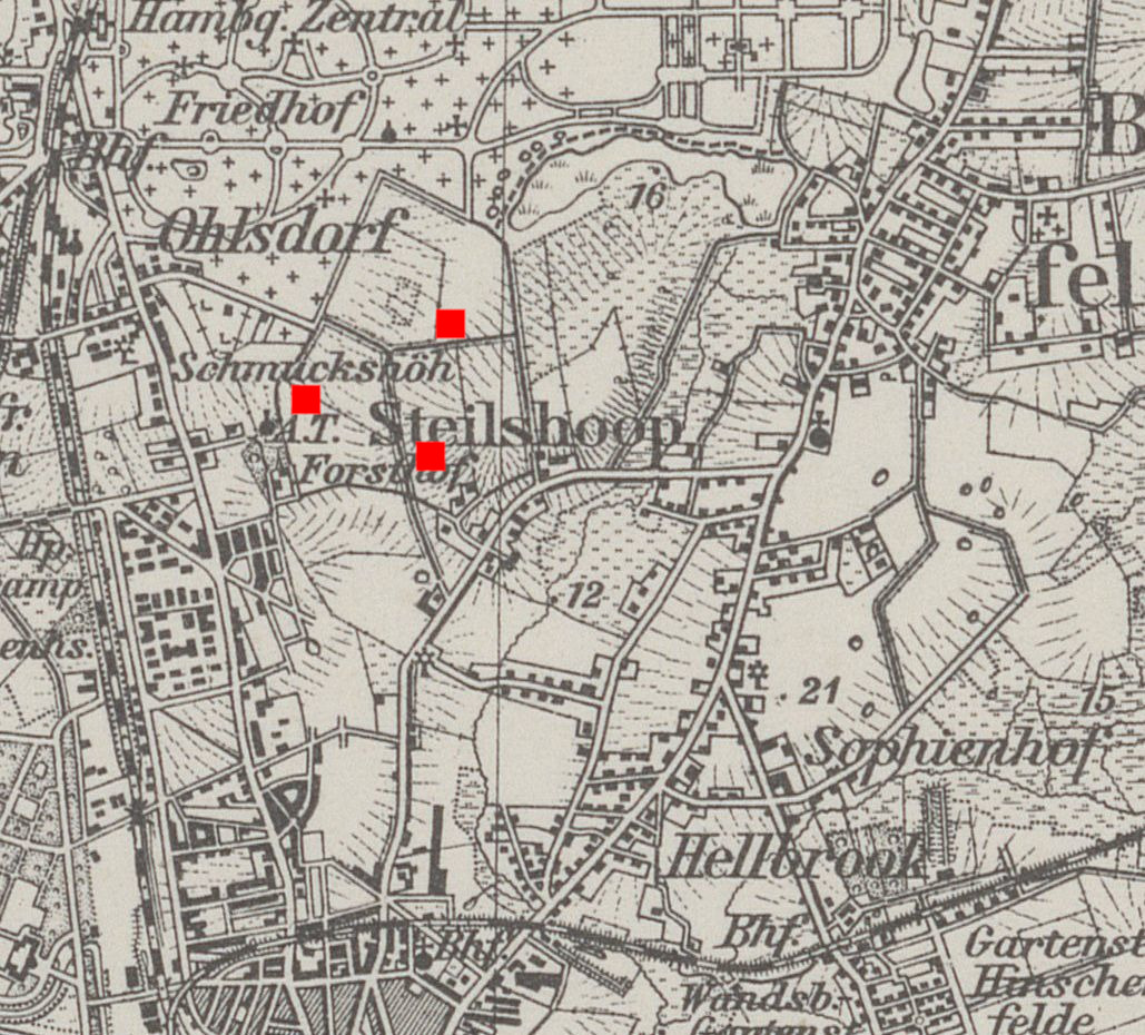 Einige dieser Bomben fielen mindestens 1943 auch auf das Gebiet von Steilshoop, wie z.B. die oben schon genannte Luftmine auf das Forsthof. Insbesondere das Gebiet angrenzend an Barmbek war davon betroffen.