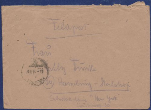 Ber Brief selbst ging zu Frau Fimke in 24 Hamburg-Steilshop in der Schreberkolonie "New York" im Ligusterweg 30 (oder 90).