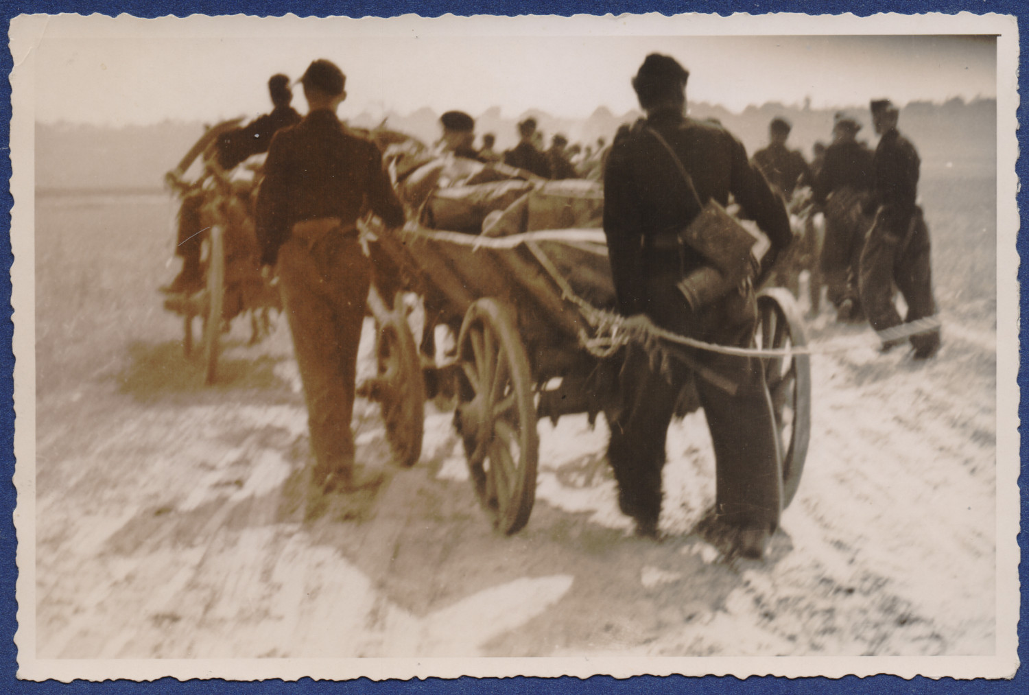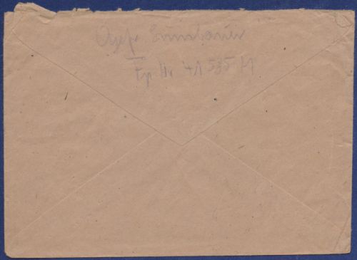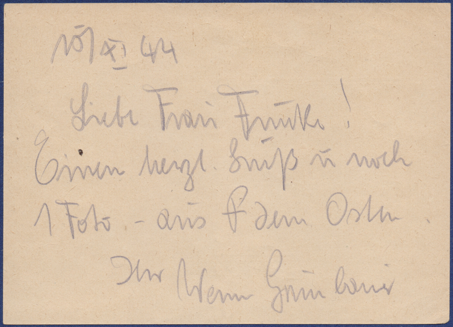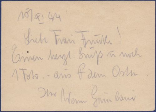 Der folgende Beleg wurde am 10. November 1944 durch den Obergefreiten Werner Grünboner erfasst. Er enthält neben dem Briefumschlag und einer mit einem kurzen Grusstext beschriebene Feldpostkarte auch ein Foto vom Marsch einer Infanterieeinheit auf einer Straße im Osten.Dieser Brief wurde durch die Feldpoststelle am 18.11.1944 gestempelt. Leider ist der Stempel verschmiert und gibt keine weitere Informationen preis.